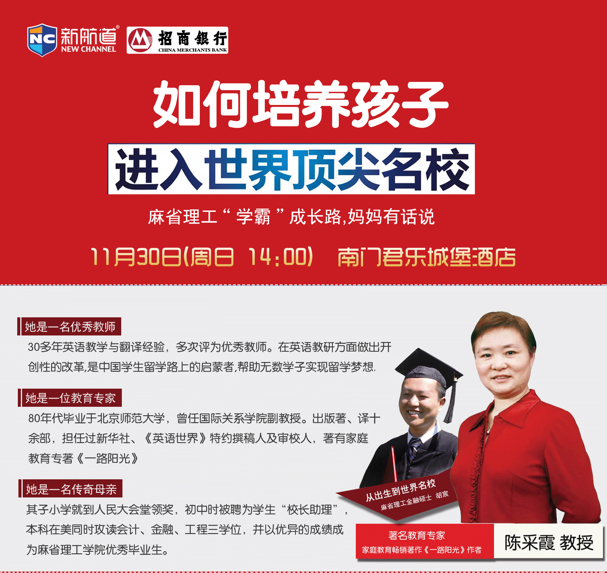 在陈采霞教授新书《一路阳光》出版之时,在新航道留学妈妈俱乐部邀请下,陈采霞教授将于11月30日莅临西安新航道,与各位留学妈妈一同探讨子女教育心得,培养“学霸”。