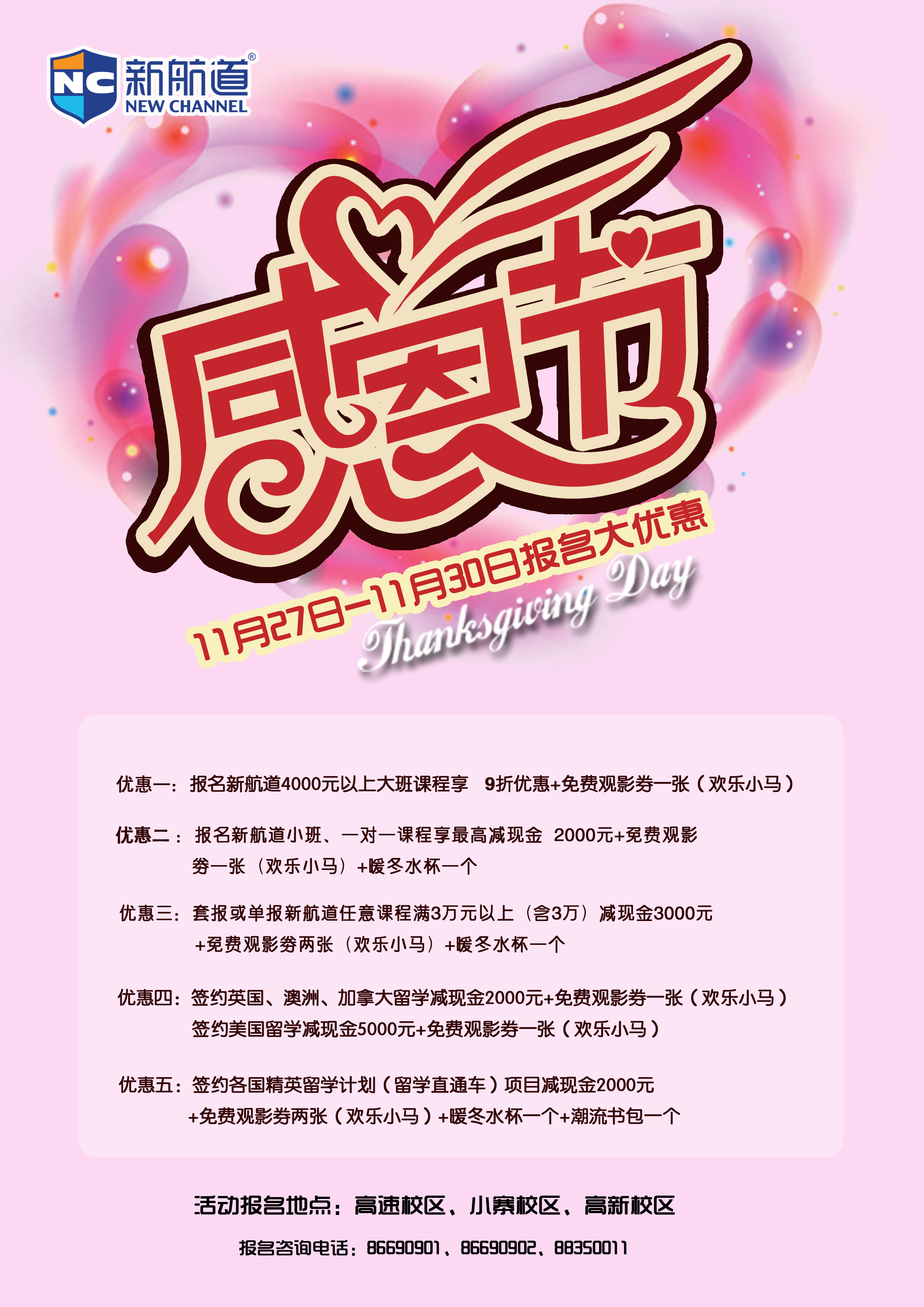 Ø 优惠二:报名新航道小班、一对一课程享减现金2000元+免费观影券一张(欢乐小马)+暖冬水杯一个